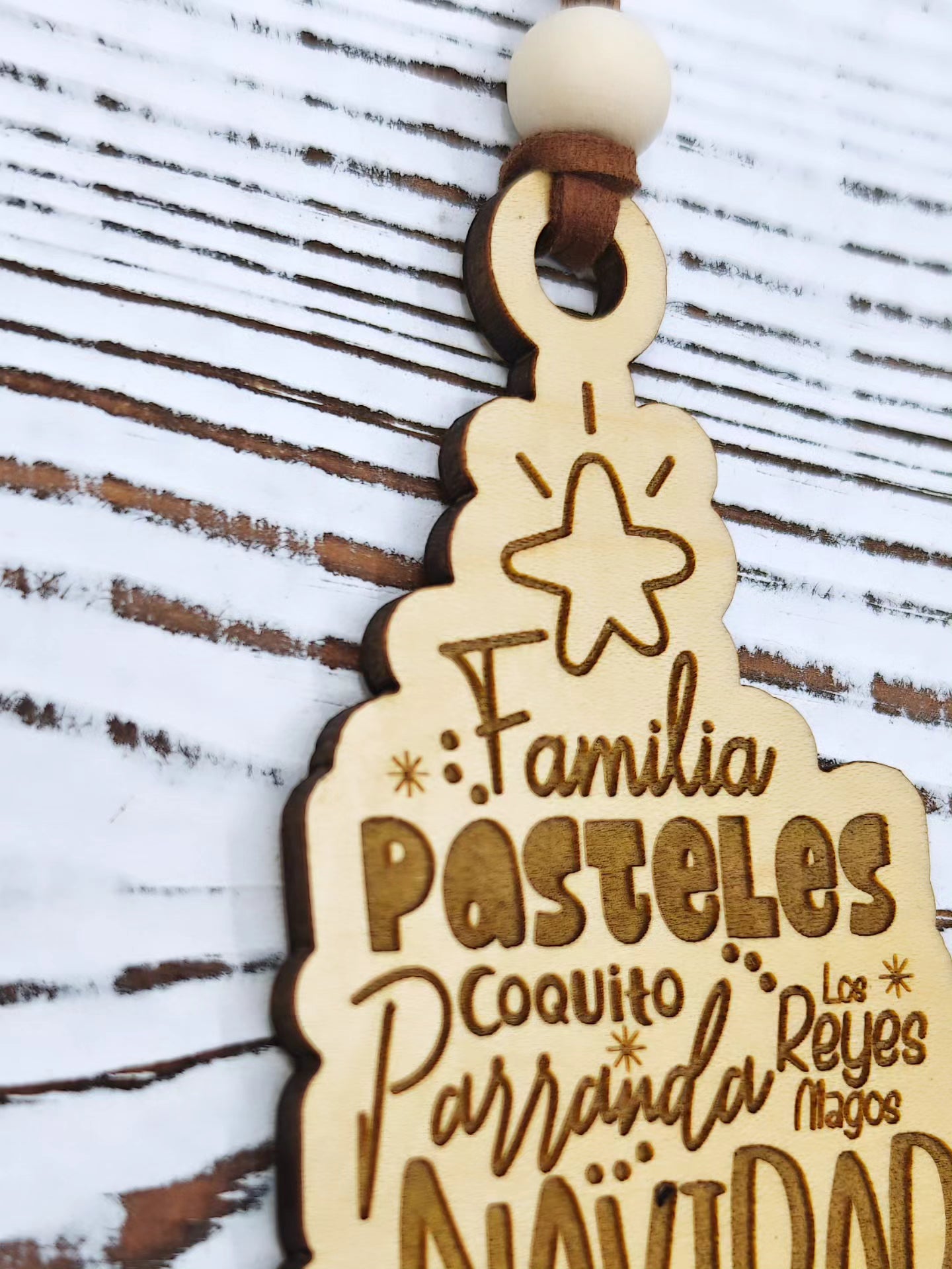 Celebra la magia de la Navidad Boricua con este adorno hecho en madera, grabado con esas palabras que llenan de sabor y alegría nuestras fiestas: Familia, Pasteles, Coquito, Parranda, Los Reyes Magos...
