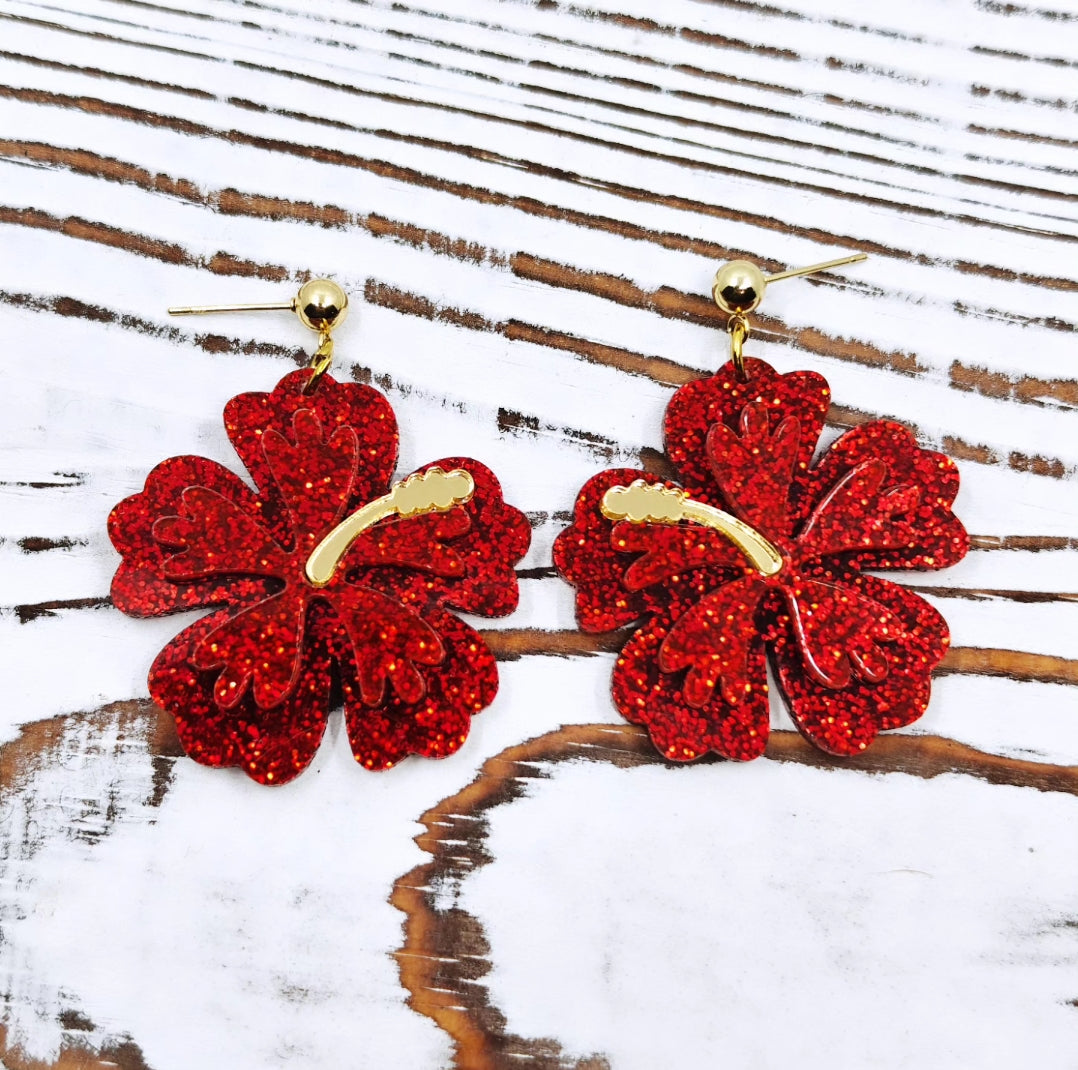 Dale un toque tropical y llamativo a tu look con estas pantallas en forma de amapola roja. Están hechas en acrílico con acabado brillante y detalles en glitter que resaltan con cada movimiento. El centro dorado añade un contraste elegante que las hace aún más especiales.