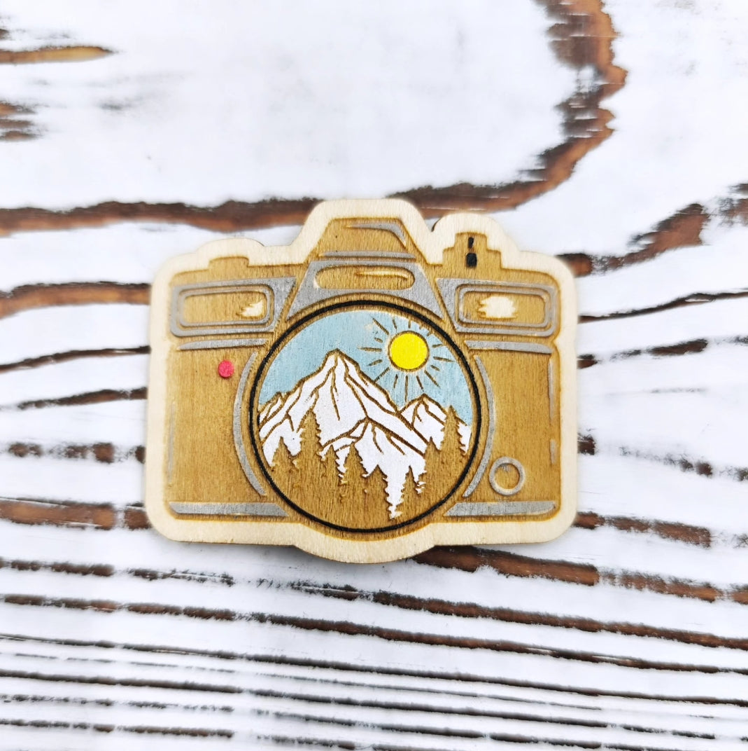 Este sticker de cámara combina la pasión por la fotografía con la belleza de la naturaleza. Grabado y cortado en madera, su diseño muestra un paisaje de montañas, pinos y sol dentro del lente de la cámara, transmitiendo aventura y creatividad. Puedes elegir entre la versión natural en madera o la pintada a mano, que resalta con colores vibrantes.