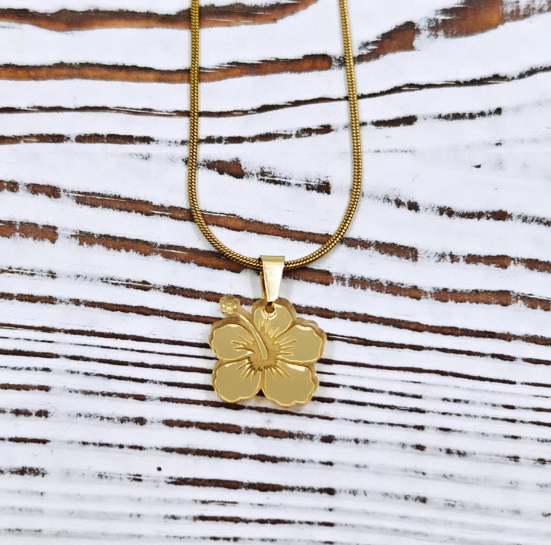 Este collar presenta un charm en forma de amapola hecho en acrílico dorado tipo espejo, que refleja la luz con un brillo encantador. La cadena de acero inoxidable (stainless steel) le añade durabilidad y un acabado sofisticado, ideal para uso diario o para dar un toque tropical a cualquier outfit.