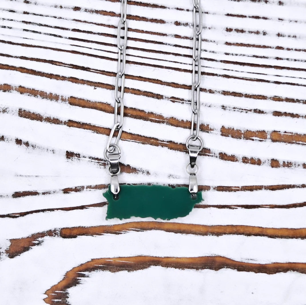 Collar con la silueta de Puerto Rico en acrílico verde, minimalista y moderno.