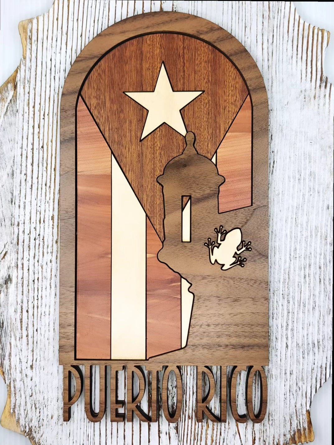 Este cuadro combina el orgullo boricua en una sola pieza: la bandera de Puerto Rico, una garita del Viejo San Juan y el coquí, nuestro símbolo más querido.