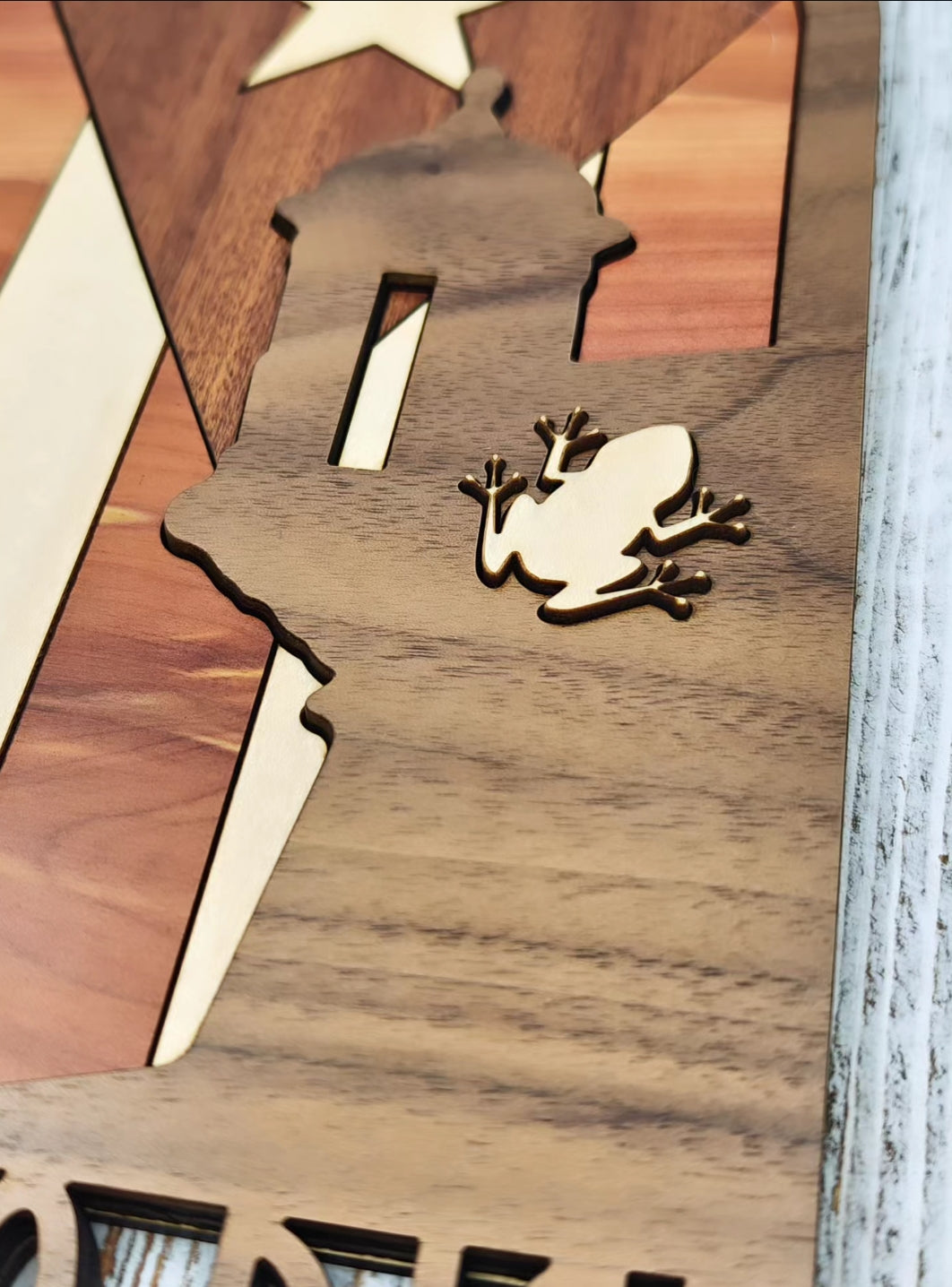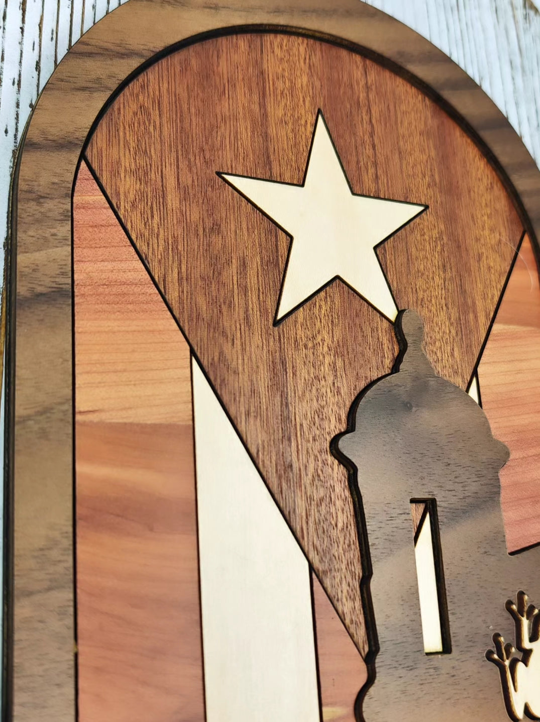 Hecho con cuatro tipos de madera natural —nogal, arce, sapeli y cedro—, cada especie aporta su tono único, creando un contraste cálido y elegante. El diseño en capas le da un efecto tridimensional que lo convierte en una pieza decorativa llamativa y con gran detalle artesanal.