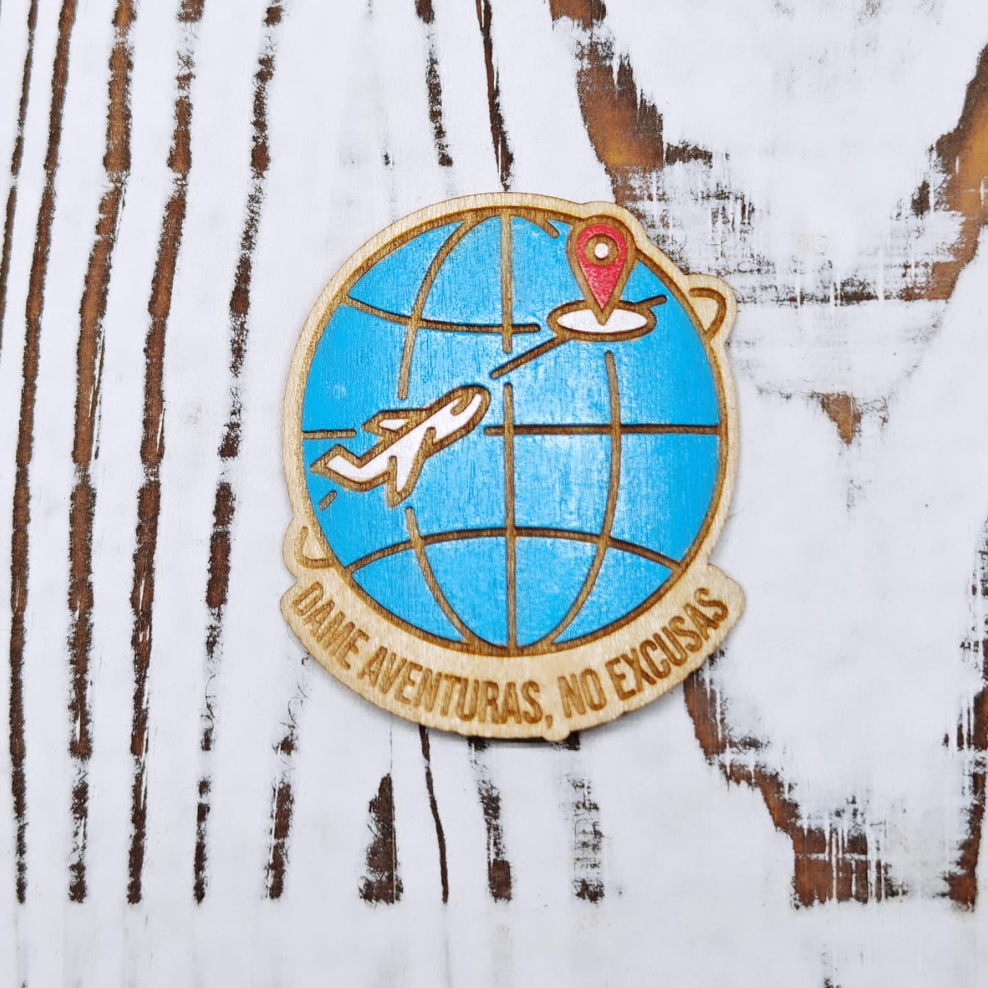 For those who keep their passport ready and their excuses tucked away. This wooden sticker features an engraved airplane flying over a globe, with the message: “Dame aventuras, no excusas” — “Give me adventures, not excuses.”
