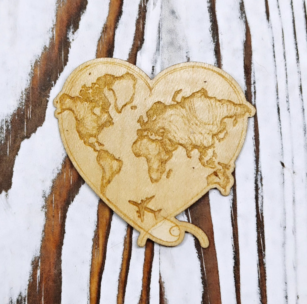 Este sticker de madera en forma de corazón con un mapa del mundo y un avión grabado es perfecto para los amantes de los viajes y la aventura. Hecho con madera resistente y mucho amor, es una forma única de expresar tu espíritu viajero.