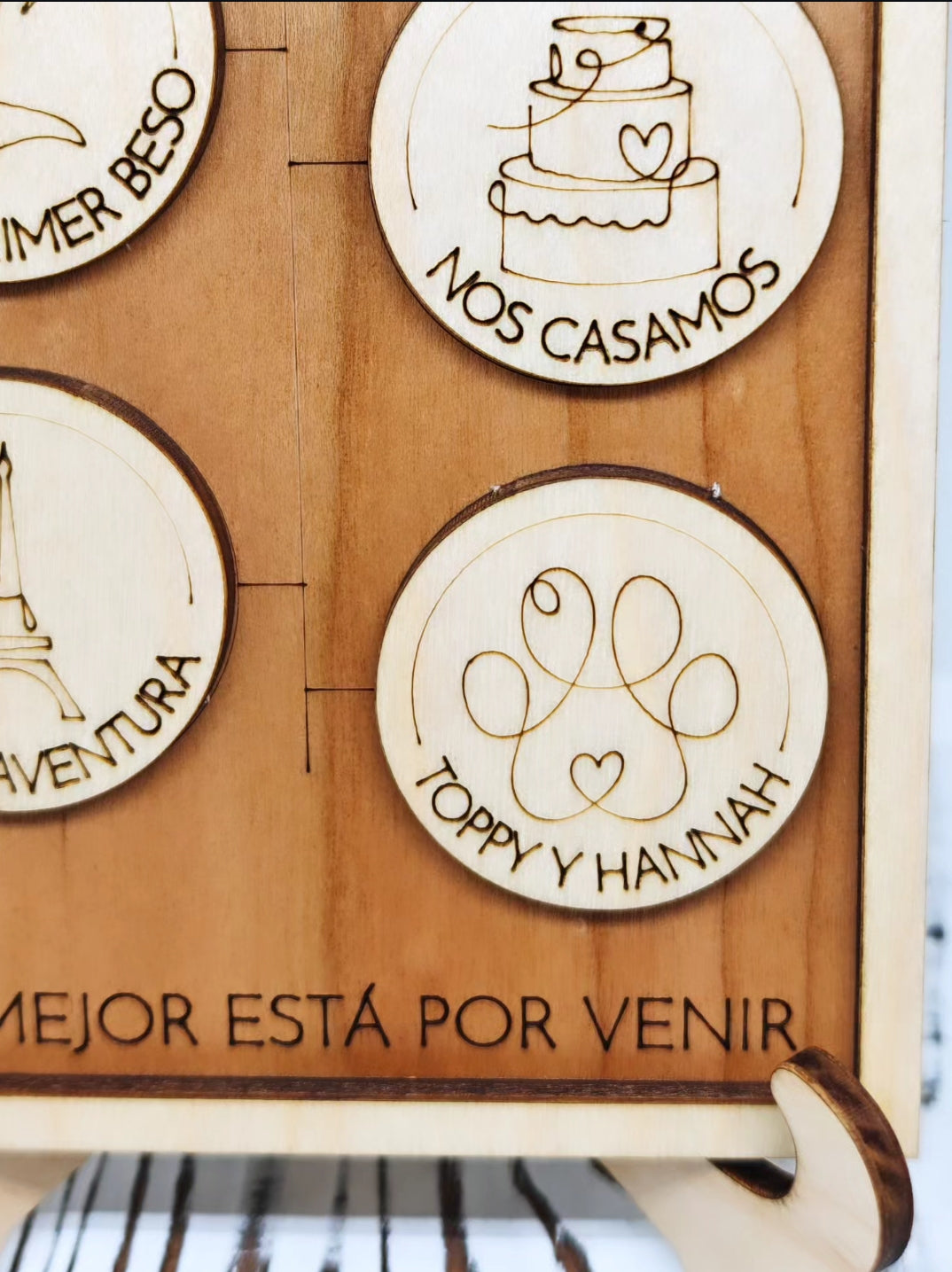 Cada historia de amor está llena de momentos únicos… y este cuadro los reúne todos en una sola pieza. “Nuestra Historia” es un cuadro personalizado en madera que narra los capítulos más importantes de una pareja, desde cómo todo empezó hasta lo mejor que aún está por venir.