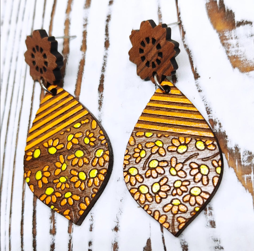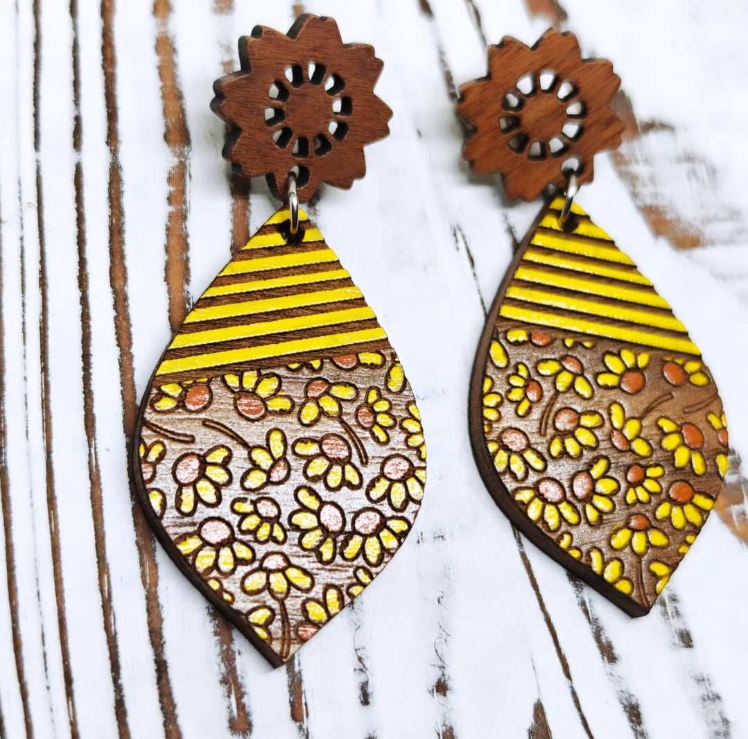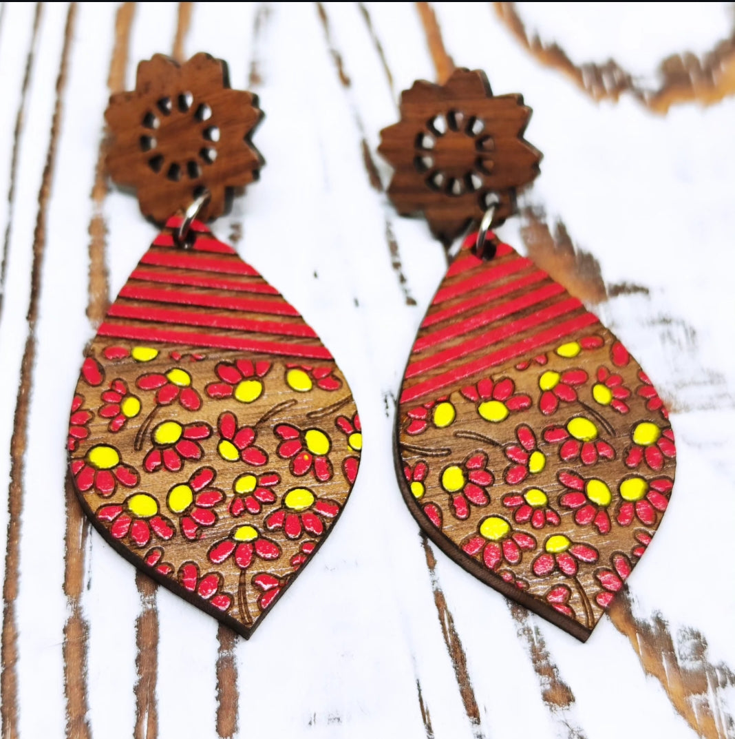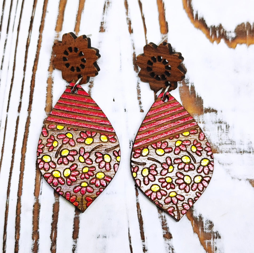 Pantallas hechas en madera, con un diseño delicado que combina formas florales y detalles geométricos en capas. Cada pieza está pintada a mano, resaltando el contraste de colores y la textura natural de la madera.