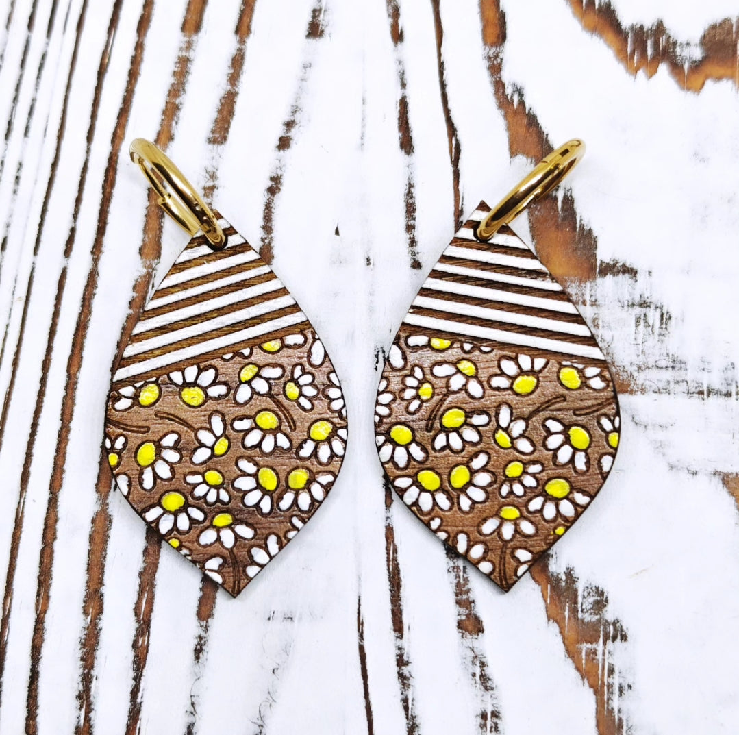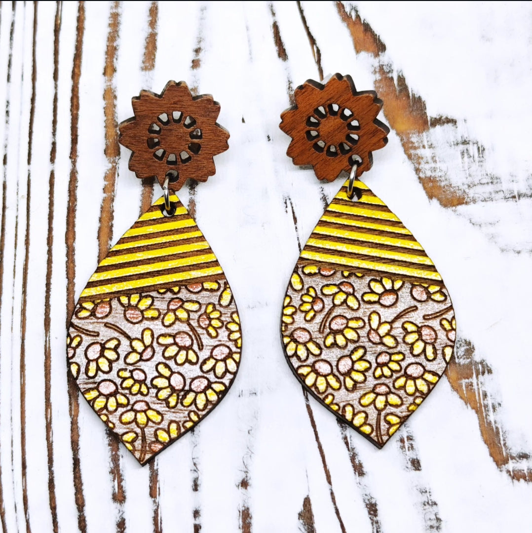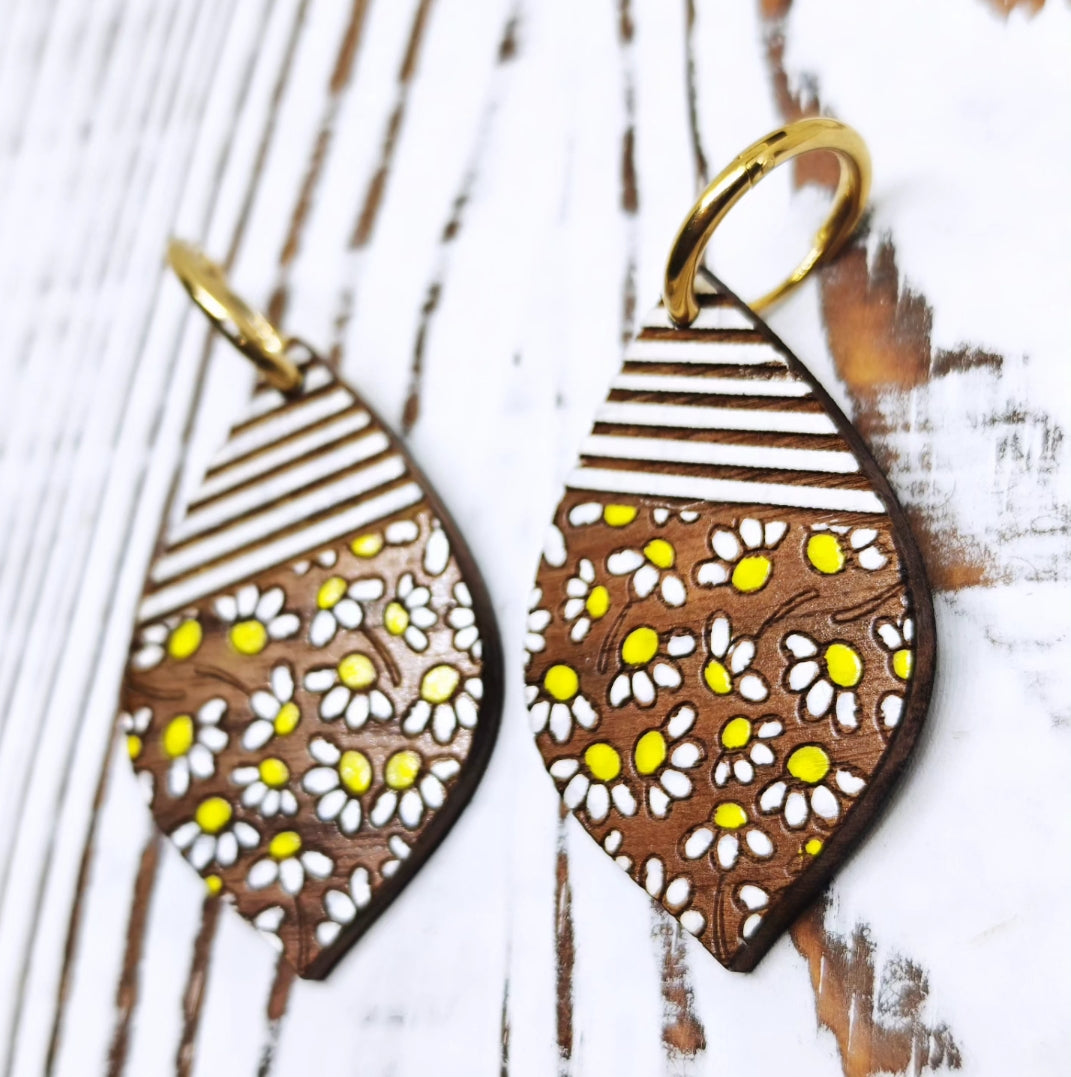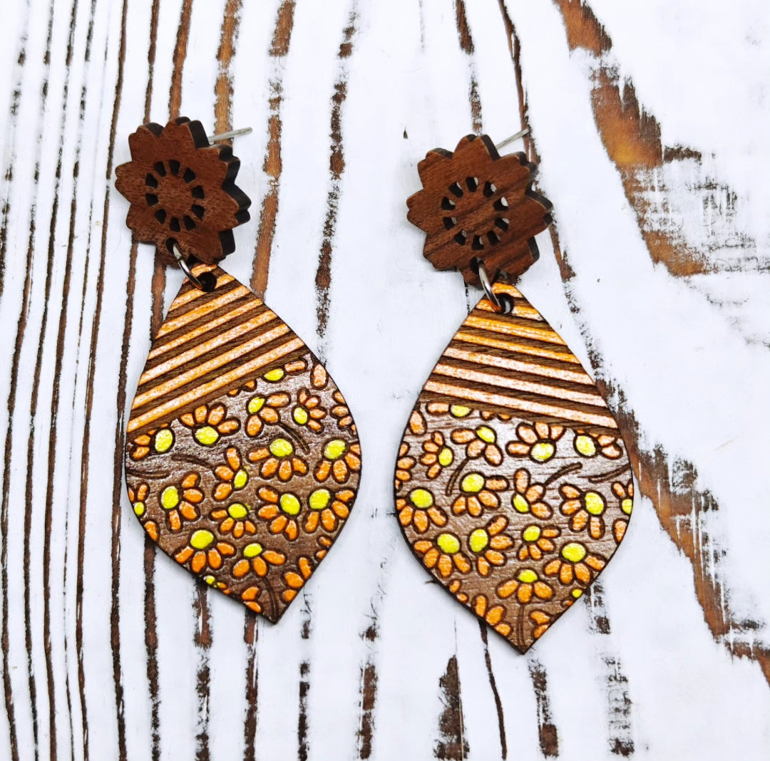 Pantallas hechas en madera, con un diseño delicado que combina formas florales y detalles geométricos en capas. Cada pieza está pintada a mano, resaltando el contraste de colores y la textura natural de la madera.