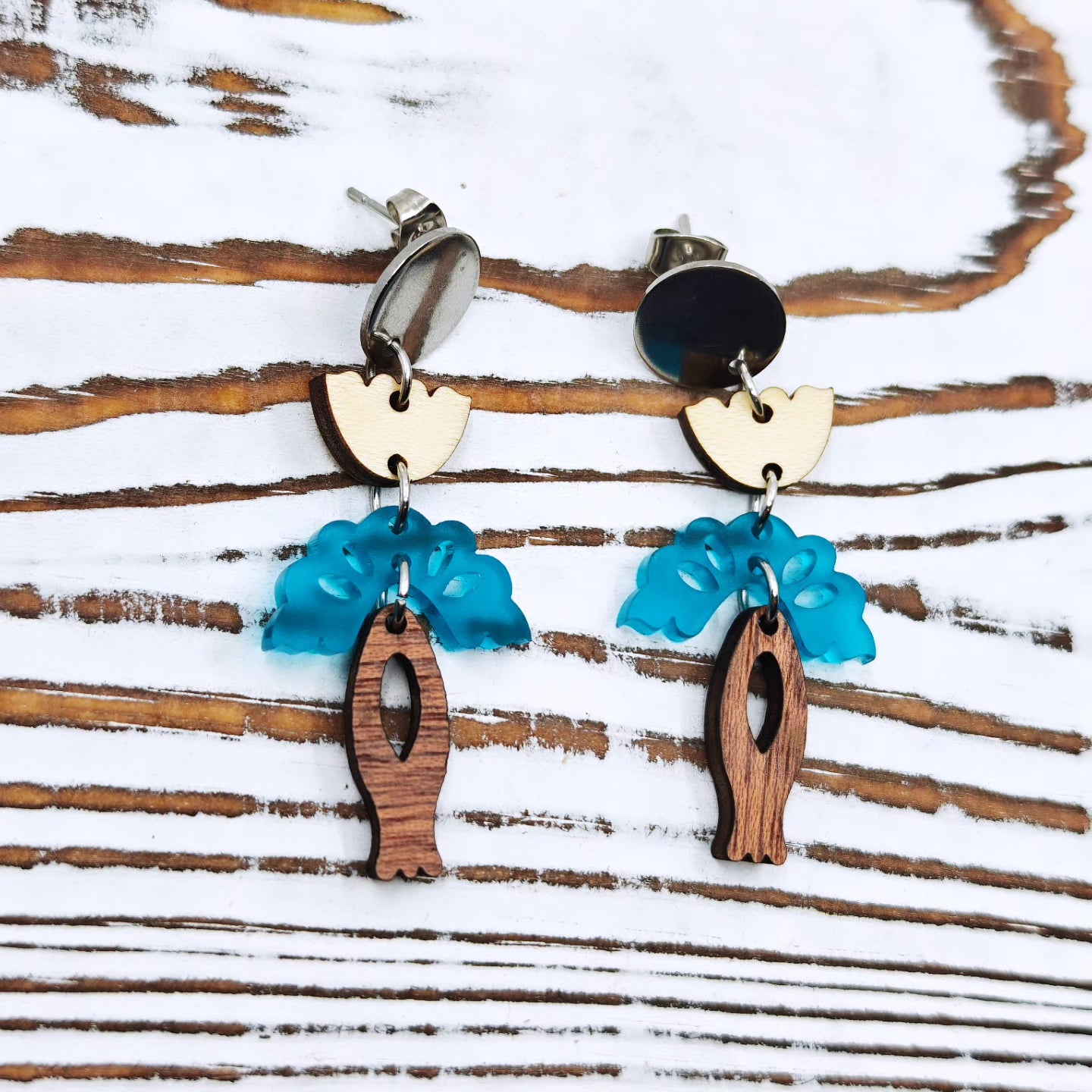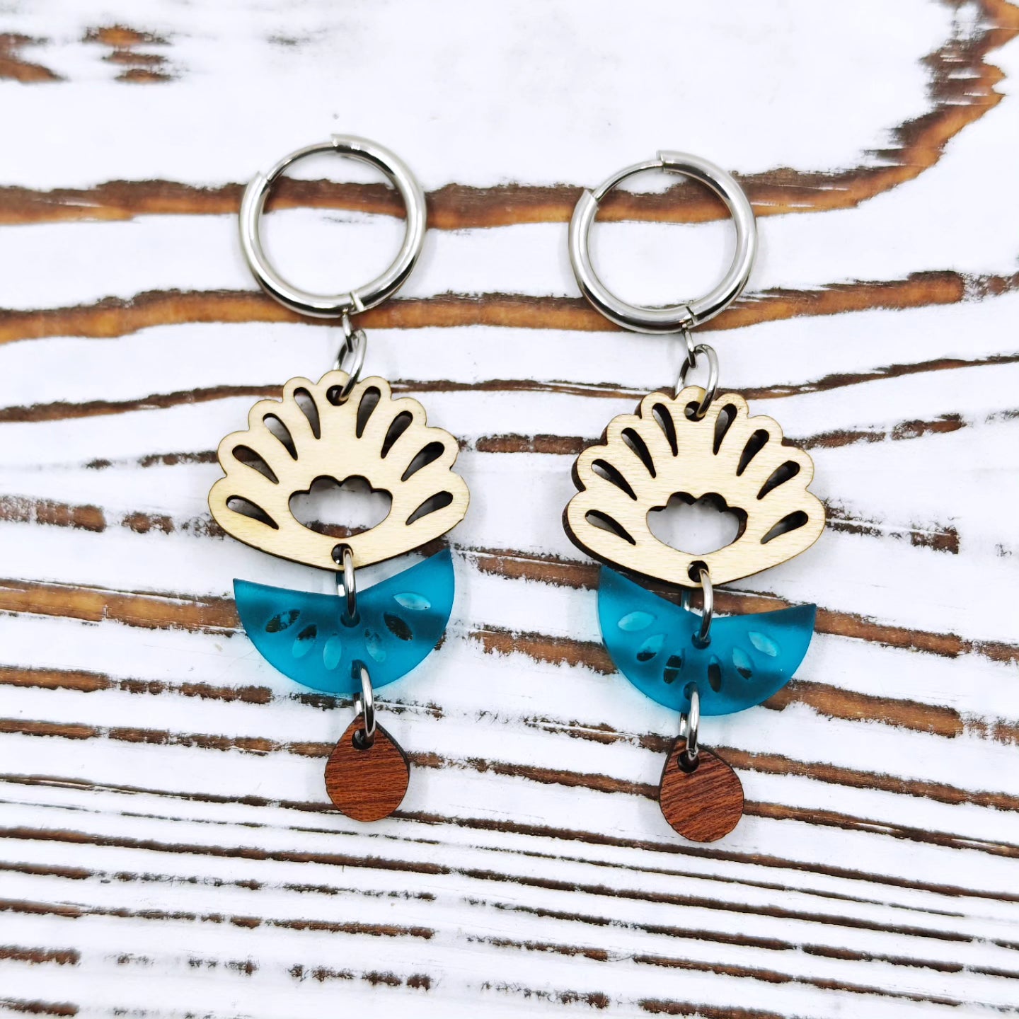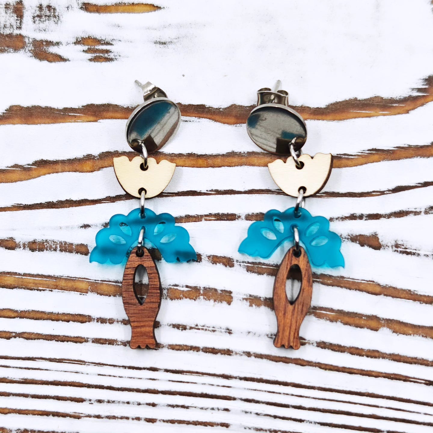 Inspiradas en los colores del Caribe, estas pantallas combinan acrílico azul translúcido y madera, logrando un estilo moderno, liviano y tropical. Cada diseño es único, con formas orgánicas que evocan flores, hojas y conchas del océano.