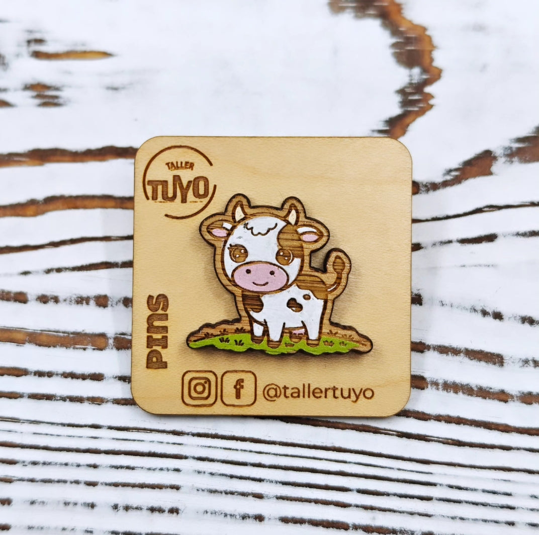 Este pin de vaquita está hecho en madera, con grabado láser y detalles pintados a mano que resaltan su encanto kawaii. Perfecto para darle un toque alegre y artesanal a mochilas, chaquetas o carteras.