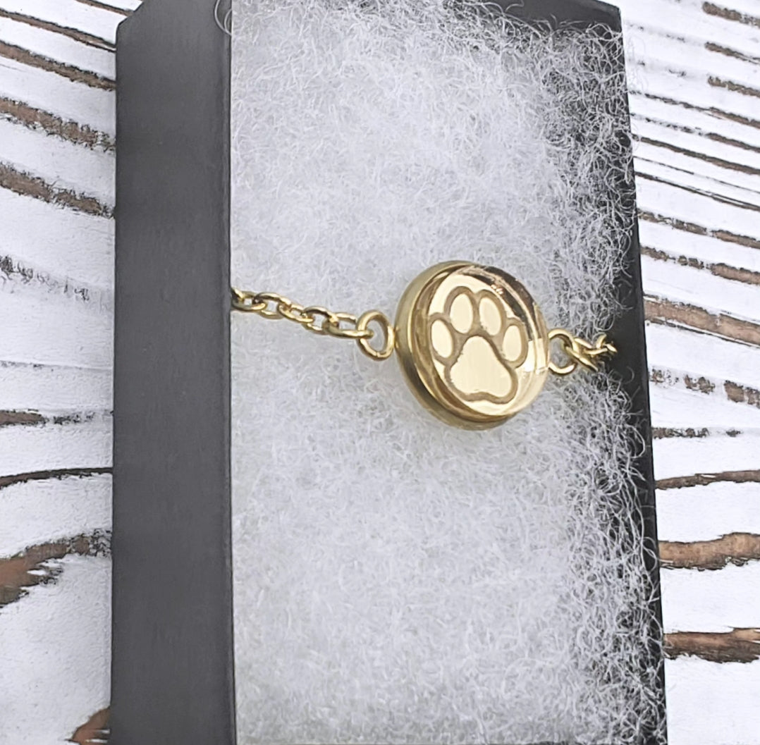 Esta pulsera combina la calidez del metal dorado con el brillo sutil del acrílico espejo. La huellita central refleja la luz con cada movimiento, convirtiéndose en un símbolo delicado y moderno del amor incondicional hacia tu compañero peludo.