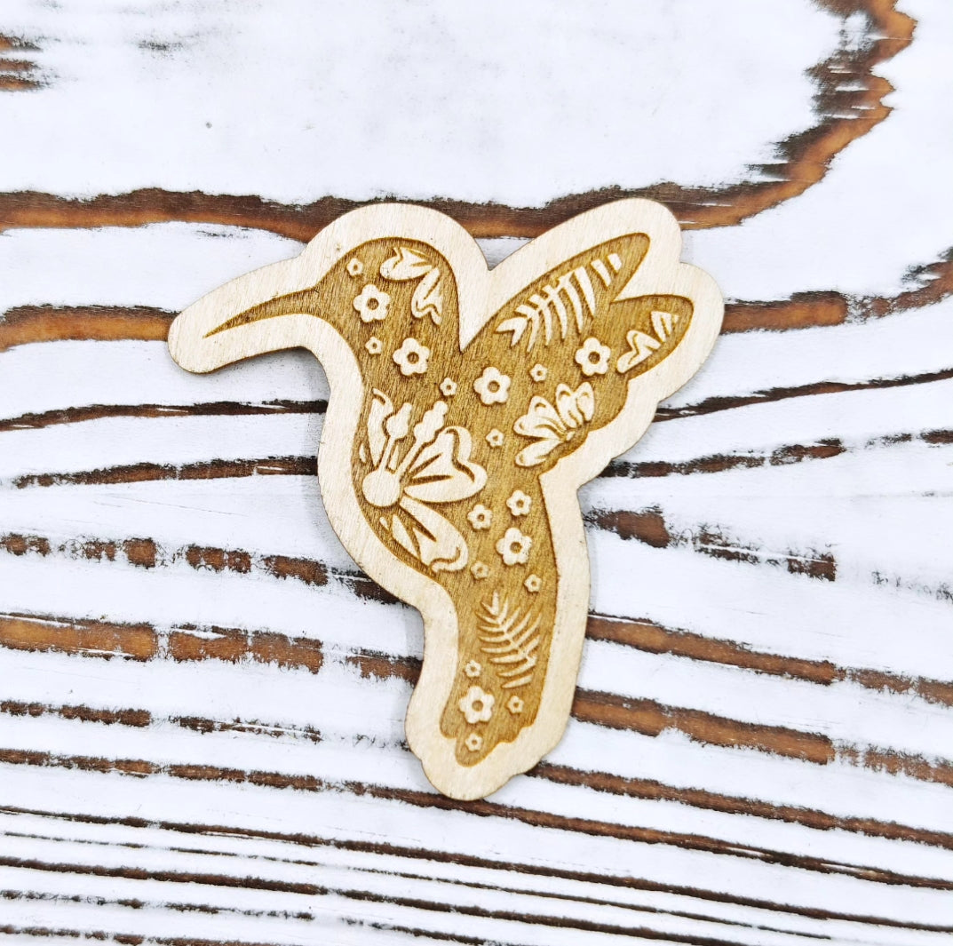 Este hermoso sticker de madera presenta la silueta de un colibrí grabado con un diseño floral lleno de detalles. Disponible en versión natural o pintada a mano con tonos vibrantes que resaltan cada flor y hoja. Perfecto para decorar laptops, botellas, libretas o cualquier superficie, incluso las curveadas, ya que es flexible y resistente al agua.