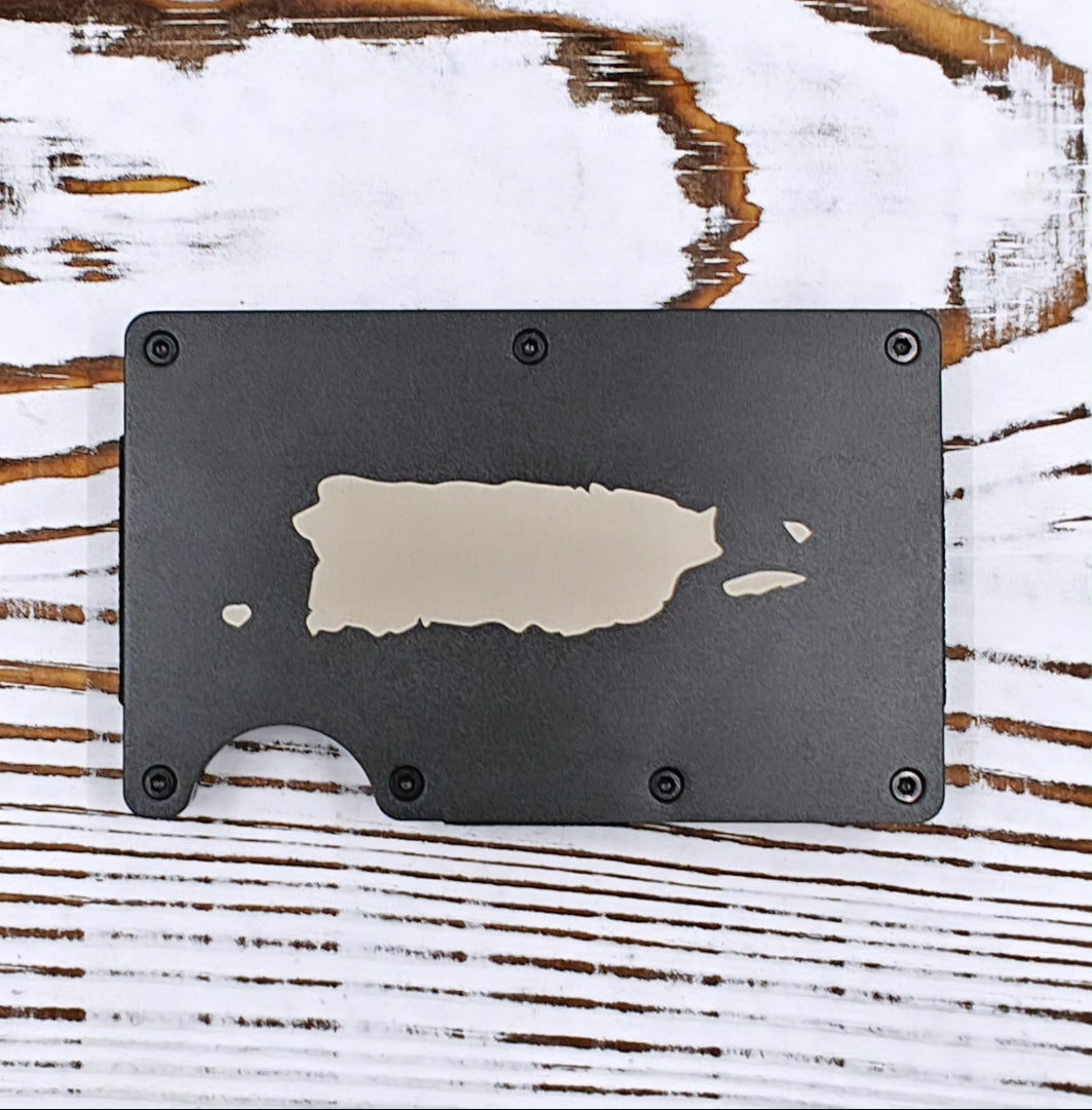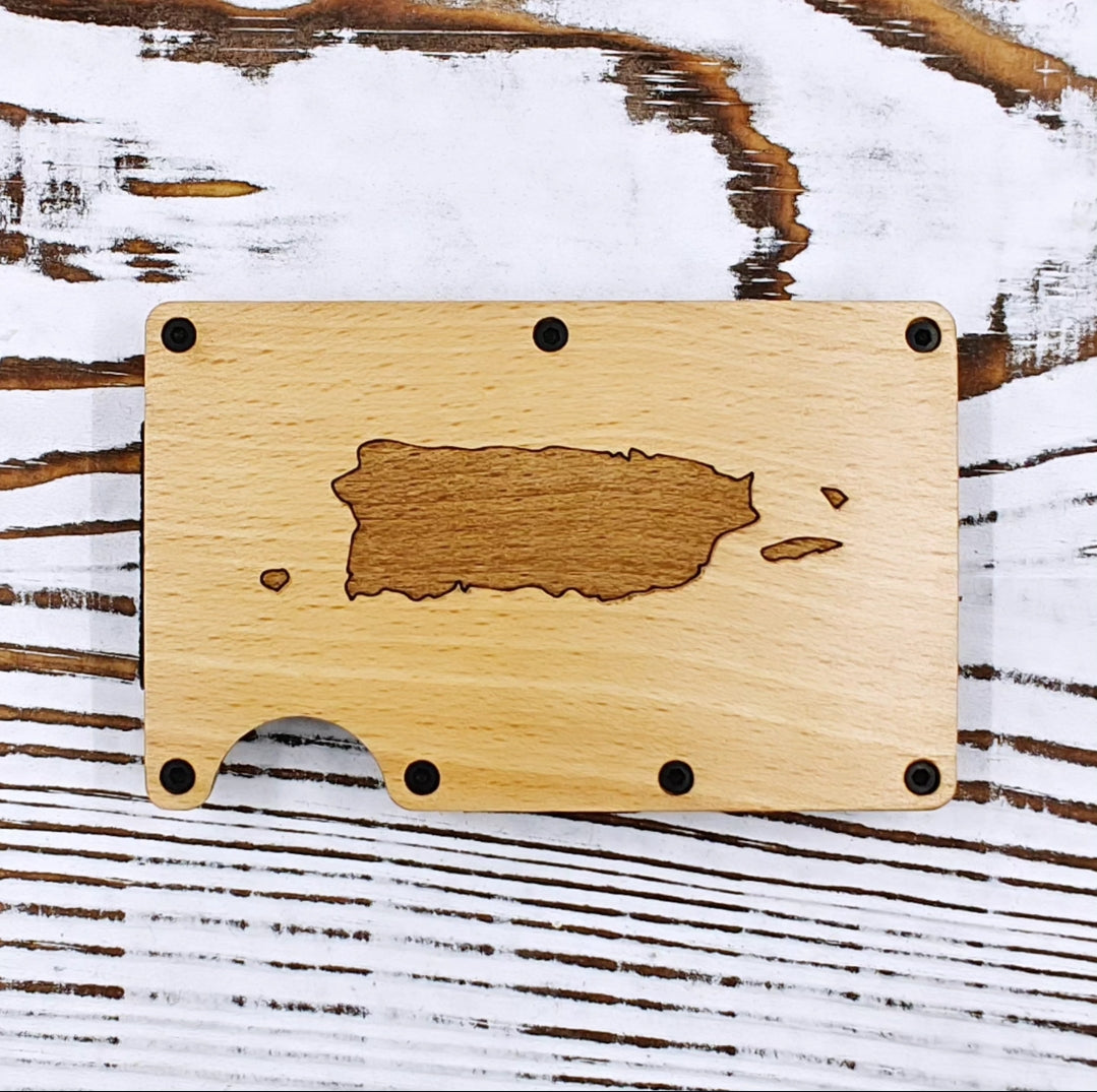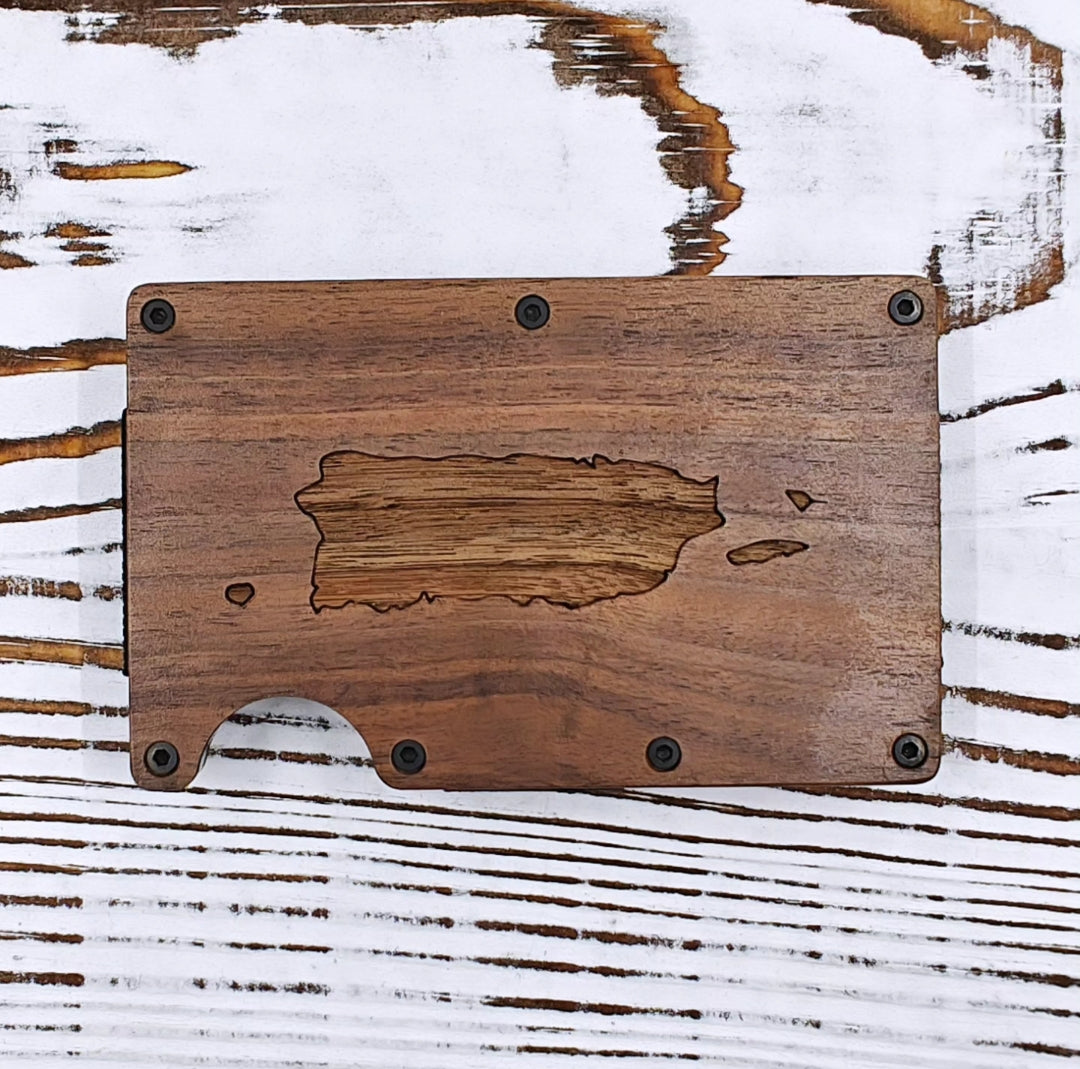 Wallet minimalista con diseño grabado del mapa de Puerto Rico, disponible en madera clara, madera oscura o metal negro. Su estilo ultradelgado y resistente es perfecto para llevar tus tarjetas de forma segura y elegante. Incluye sistema RFID blocking que protege contra clonación.